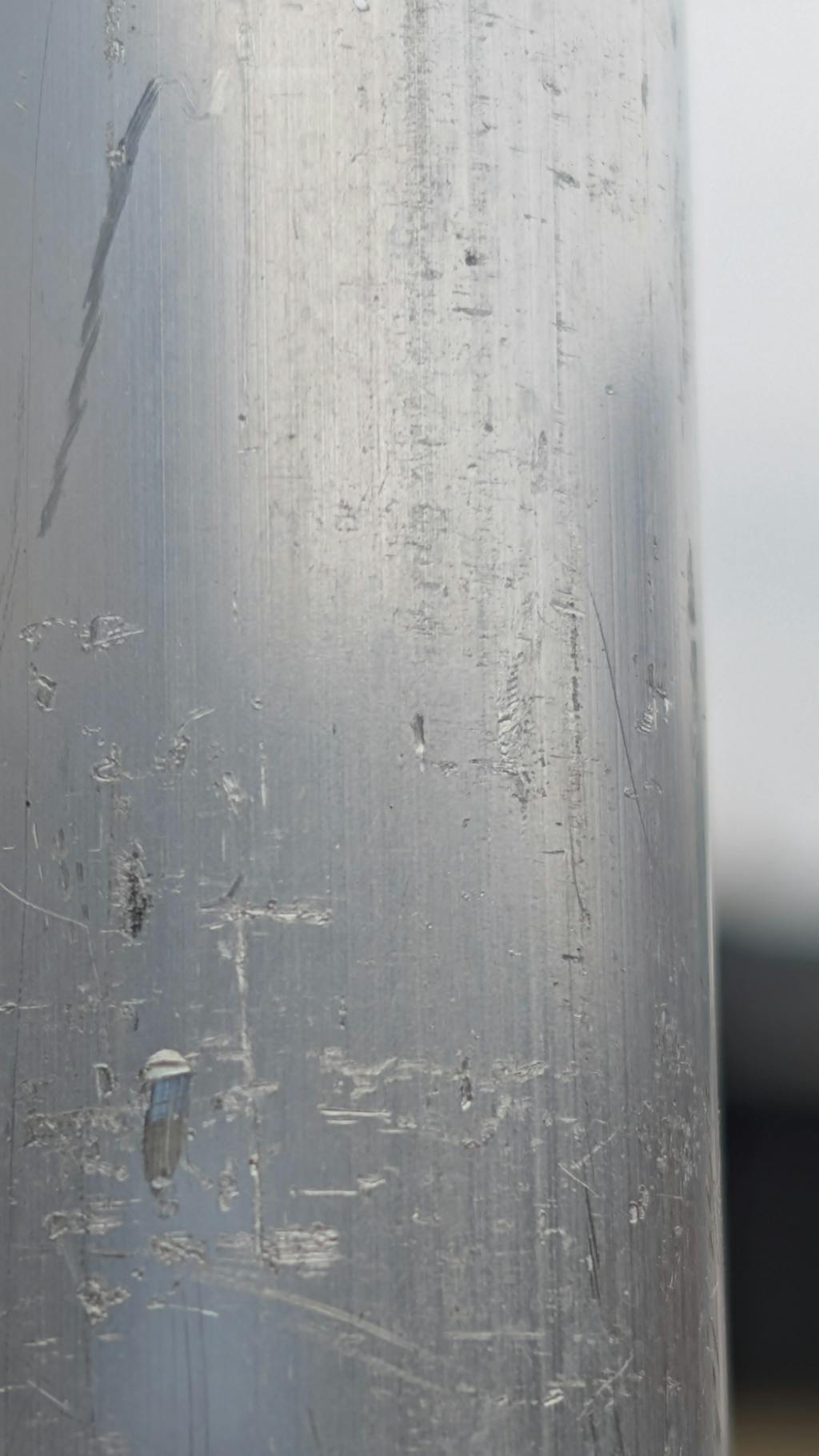 Thank you for taking the time to write your review and we appreciate your feedback. Firstly, I can confirm this is a new item. We did enquire with the manufacturer about the marks, but these are unavoidable and made by an automated machine feeding and gripping the pole during the cutting process. The pole is made of solid aluminium so these will not cause any ptoblems as far as wear or corrosion. We were offered a polishing option, however this would give a slippery finish and a 3 x higher cost!