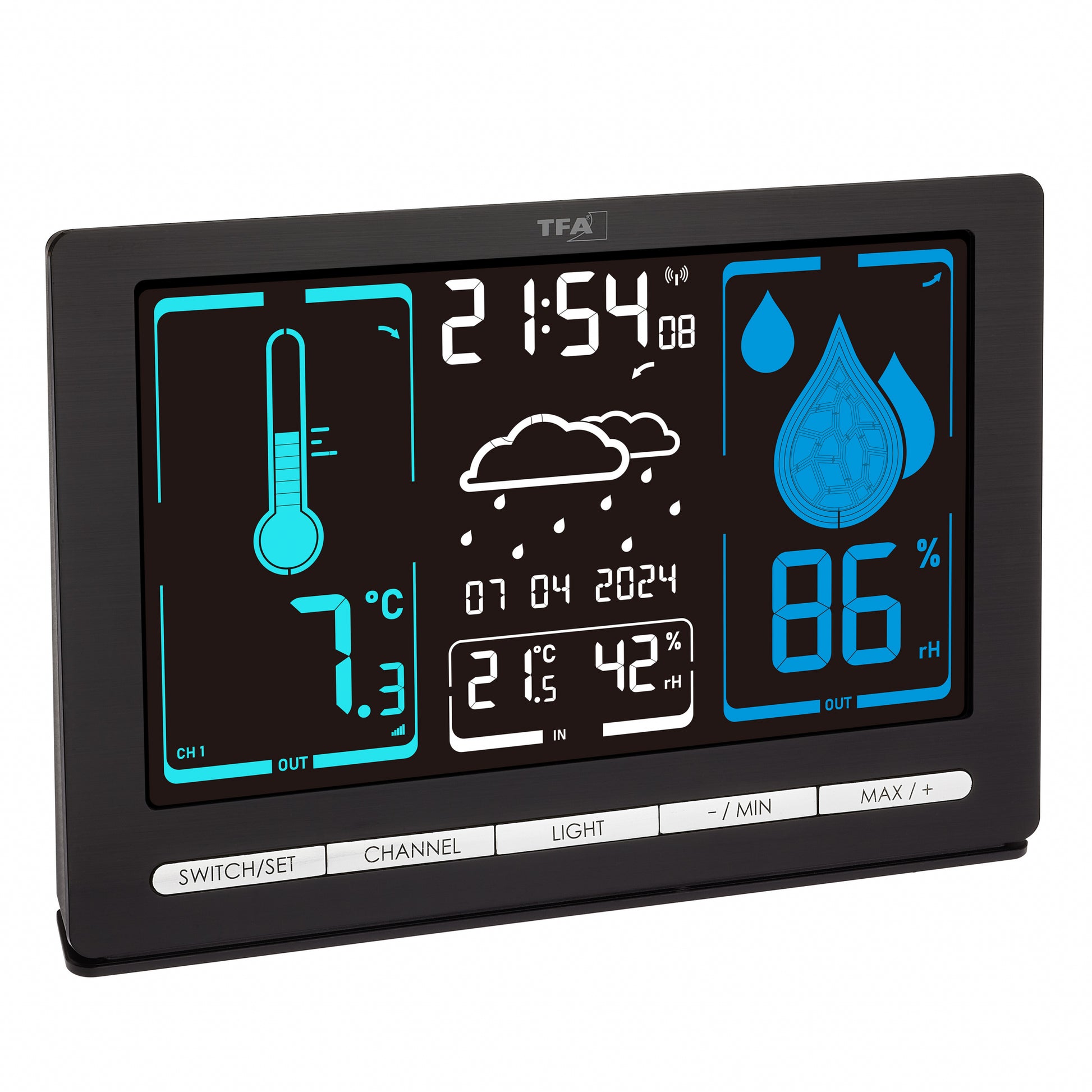A light green thermometer promises spring-like mild temperatures, thick blue drops indicate high humidity and the weather symbol in the centre fittingly announces a rain shower: With the METEOCHROME wireless weather station, you are not only well informed about current weather developments, thanks to its clear, colourful symbol display of temperature and humidity, reading the measured values is actually fun.