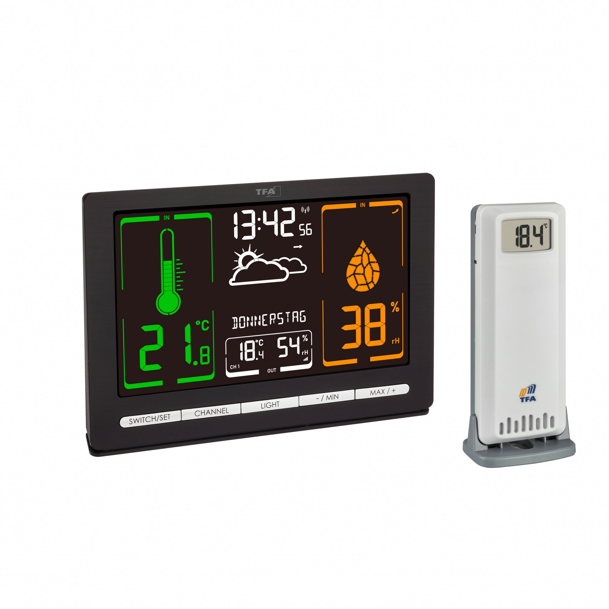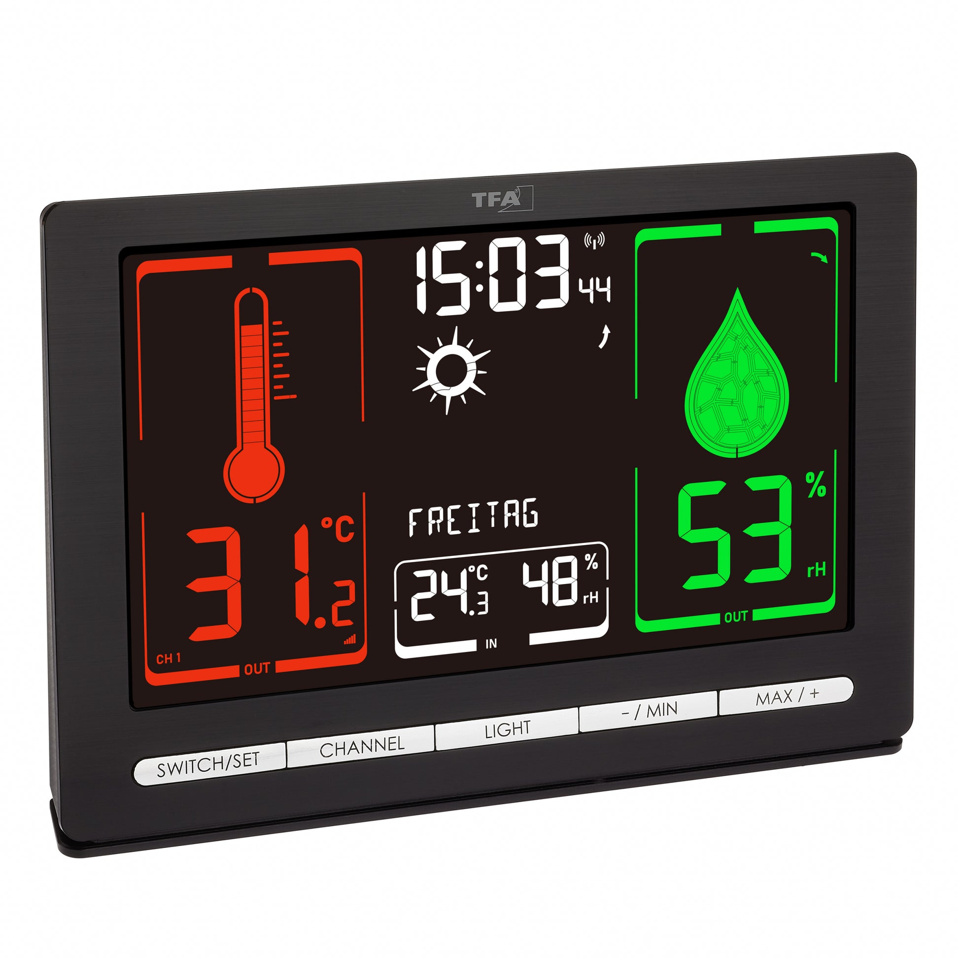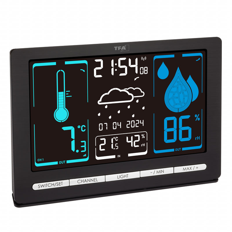 The colour, shape and measurement status of the symbols adapt to the latest values. The special VA display gives you a remarkably clear display quality, richer in contrast and more colourful in a choice of four brightness levels. A sensor with a range of up to 100 metres transmits the current data from outside, while integrated sensors at the base station's location measure the indoor climate. METEOCHROME is also able to display maximum and minimum values, including the time they were stored, as well as the date and day of the week in six different languages. The time zone can be set manually.